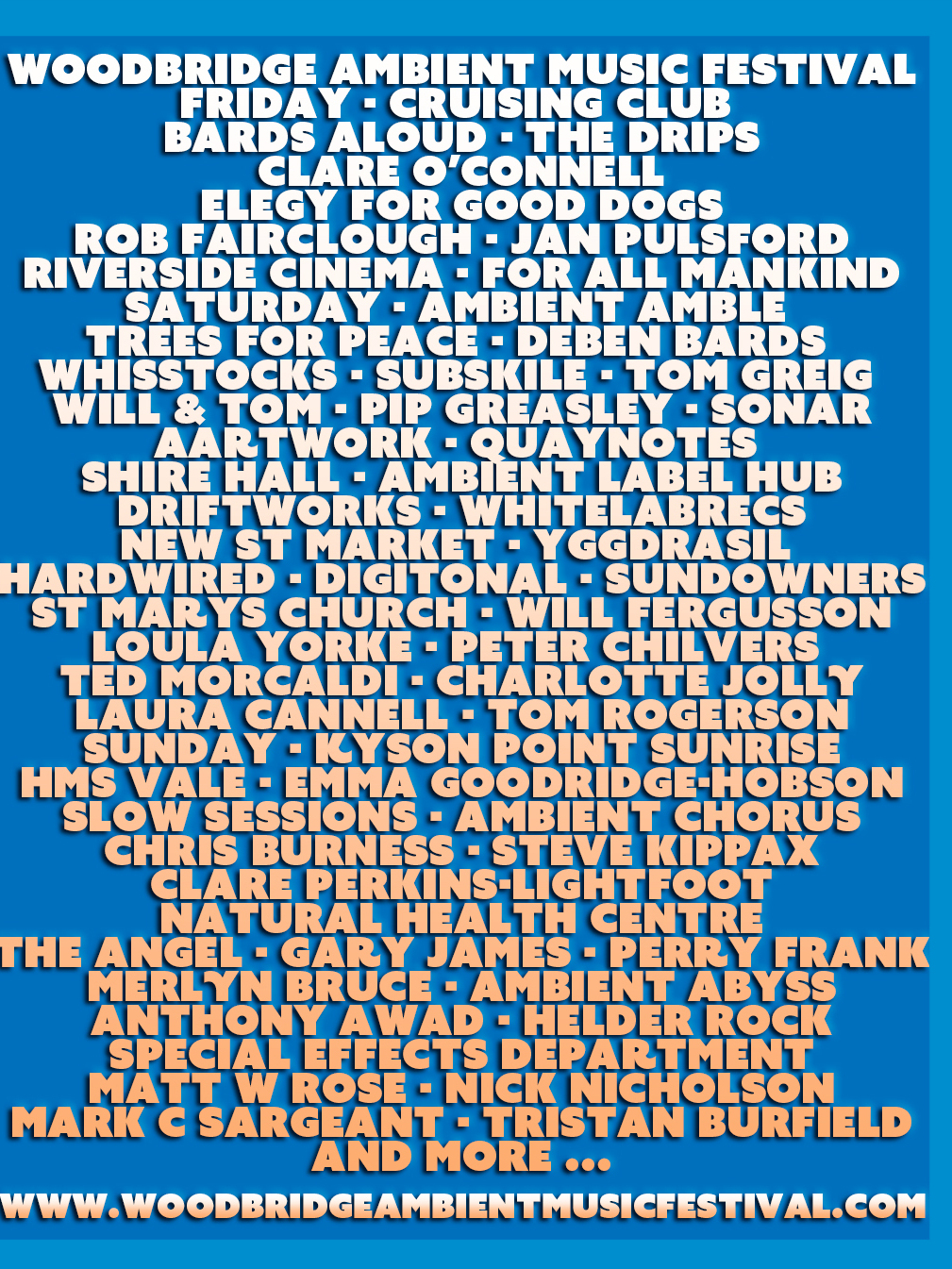 You can find up to date news and archives on the Woodbridge Ambient Music Festival website and socials