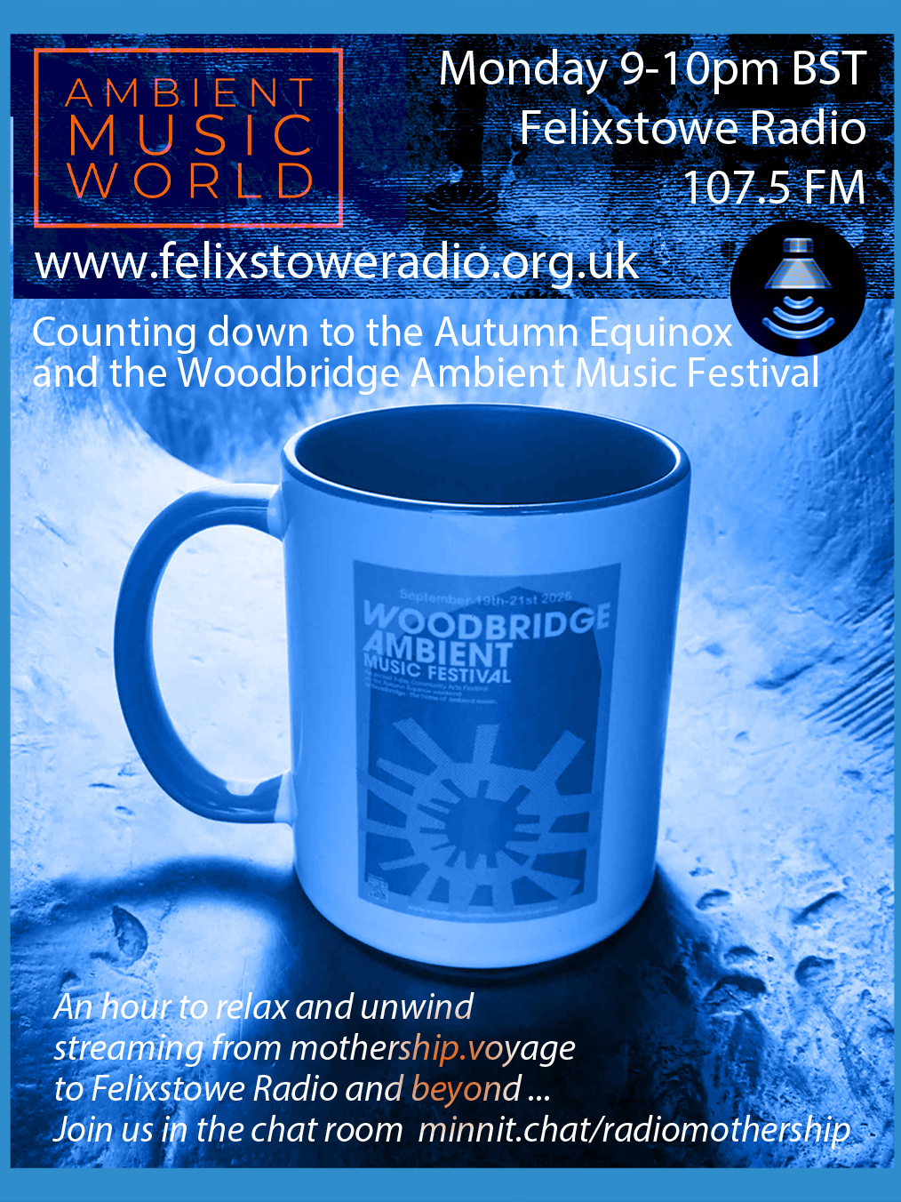 WEEKLY BROADCASTS: Every Monday we broadcast an 'ambient music world' on Felixstowe Radio at 9PM from the Mothership Voyage stream. We also have a chatroom which is a good way to catch up with the latest news as it happens - Such a lot going on behind the scenes! Do join us to chat and listen on https://minnit.chat/radiomothership